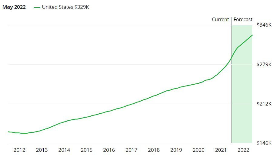 Prix moyen des maisons aux USA (estimation pour 2020 en vert), en K $ (c) Zillow Estimates