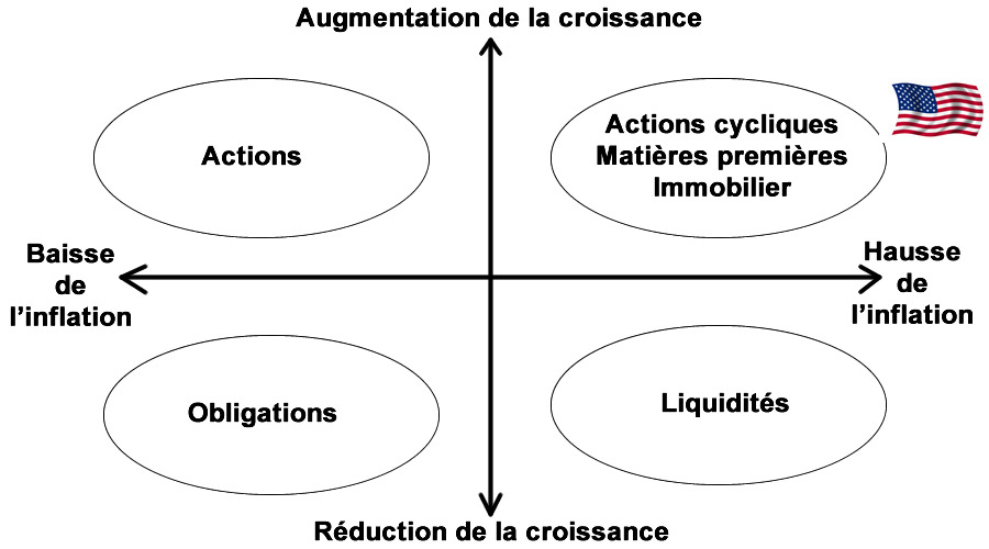 La position du drapeau de la zone géographique sur le schéma indique le ou les actifs financiers à privilégier. Sa position est calculée en fonction de la variation des indicateurs marcoéconomique de l’inflation et de la croissance.